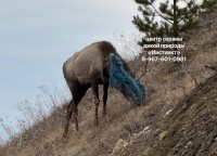 В Красноярском крае, в посёлке Манском, к людям вышел дикий марал — животное, занесённое в Красную книгу. Оно неагрессивно и явно просит о помощи: голова марала замотана тряпкой, которая зацепилась за рога и закрыла ему обзор. Марал почти ничего не видит, ему тяжело есть. Есть риск, что тряпка попадает в рот и мешает нормально питаться.